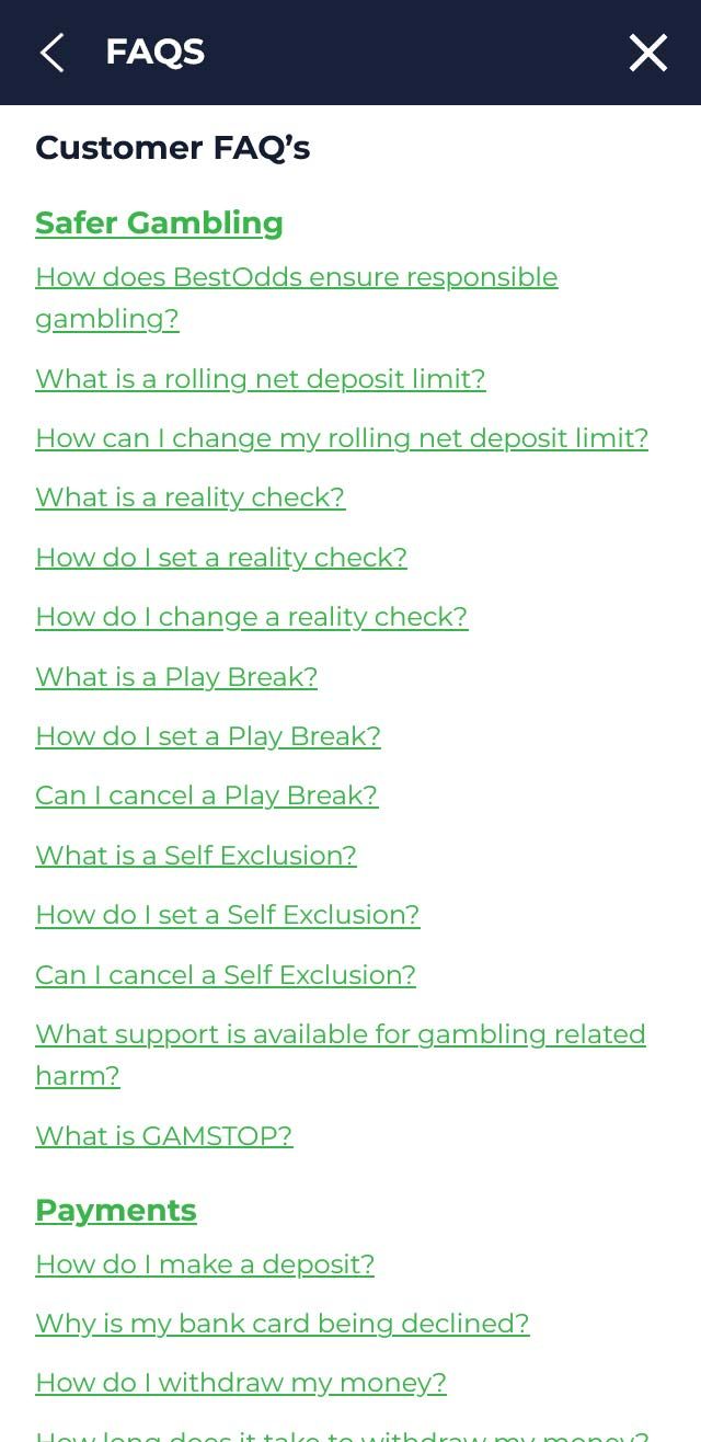 | Self-exclusion 👉 | Full self-exclusion is always available for Bestodds members |